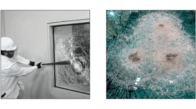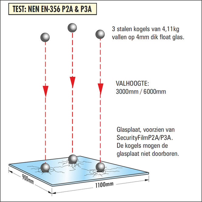Bij de (N)EN356 P2A norm wordt glas met folie beproeft, door drie maal een 4,11kg zware stalen kogel vanaf een hoogte van 6 meter op het glas te laten vallen.